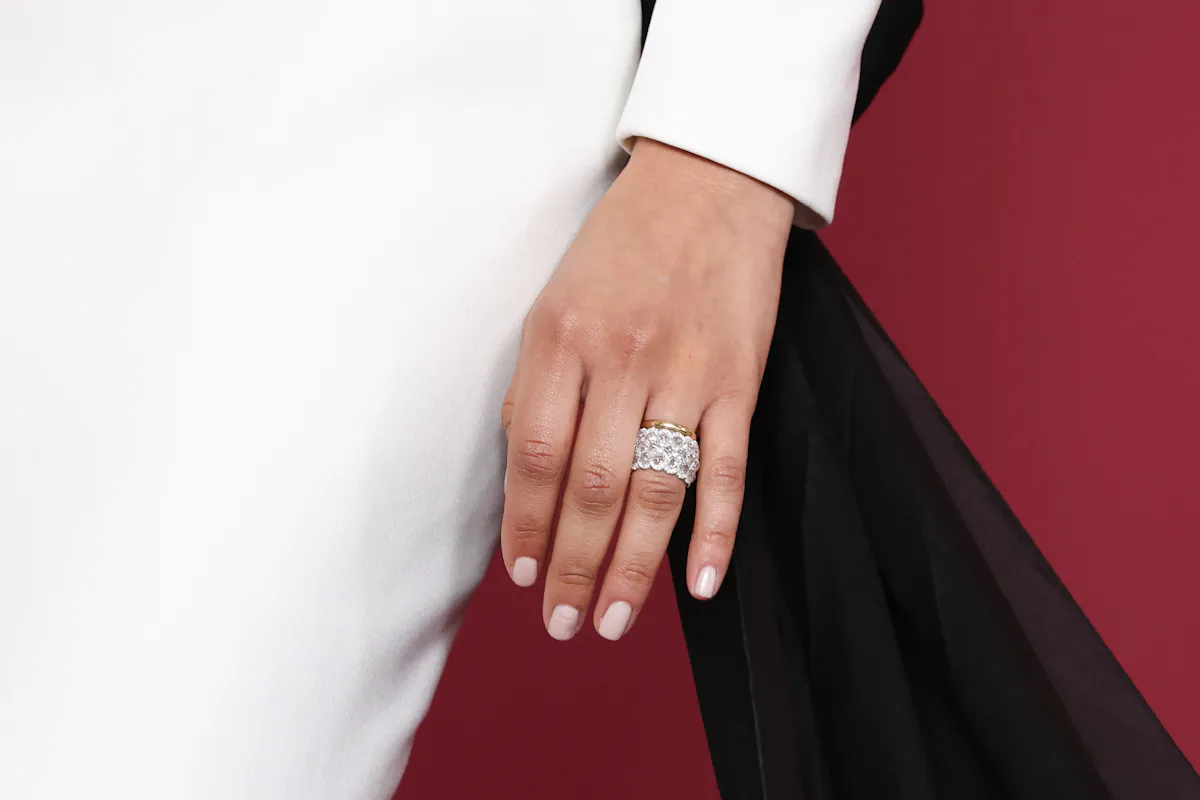 Zendaya was adorned in diamond earrings and rings from London-based jeweler David Morris. If you zoom in a little closer, which photographers have been doing intentionally, you can see a simple gold wedding band on her finger layered underneath her sparkling stones.